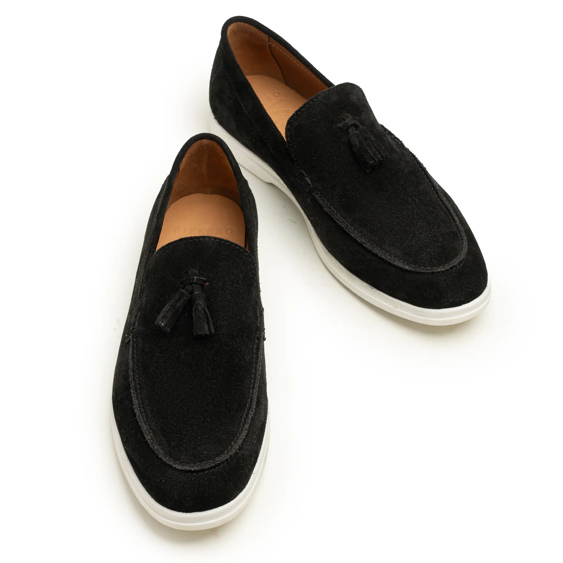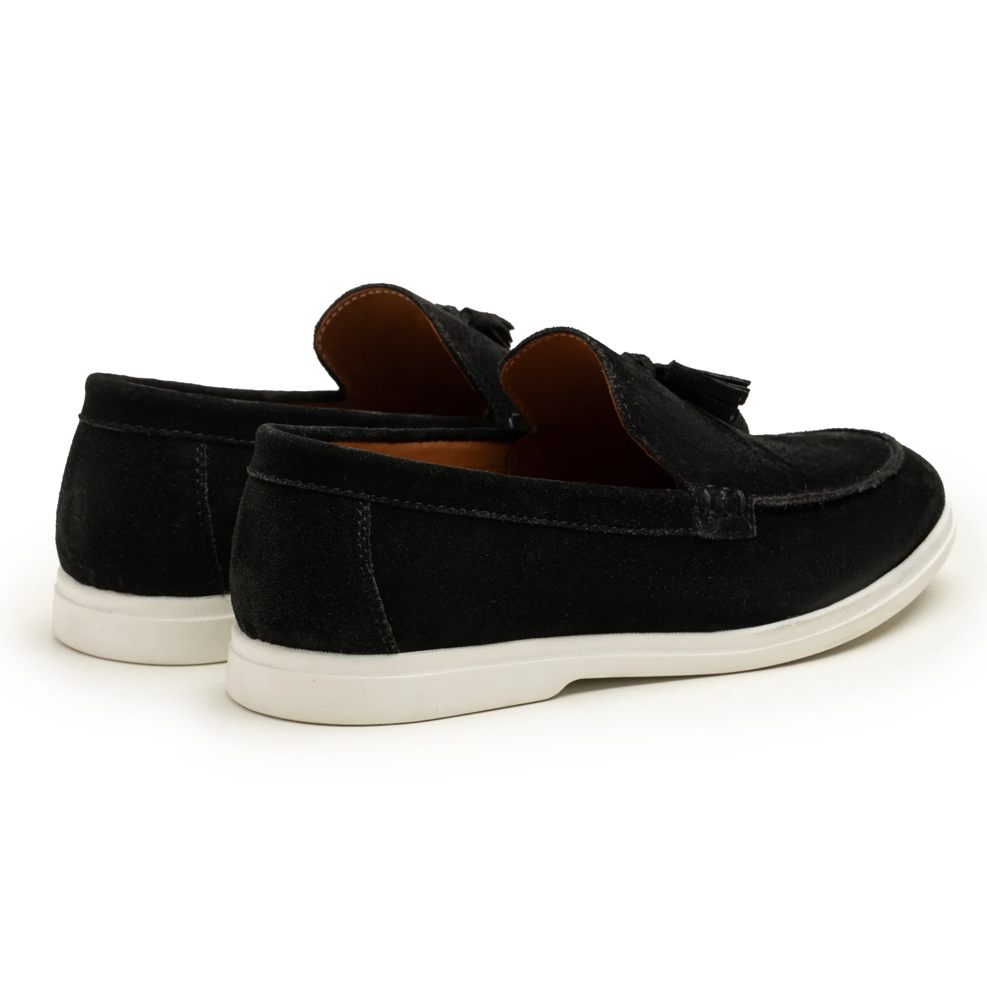 A clean black suede loafer with twin tassels, built on a lightweight white outsole for an easygoing, everyday feel